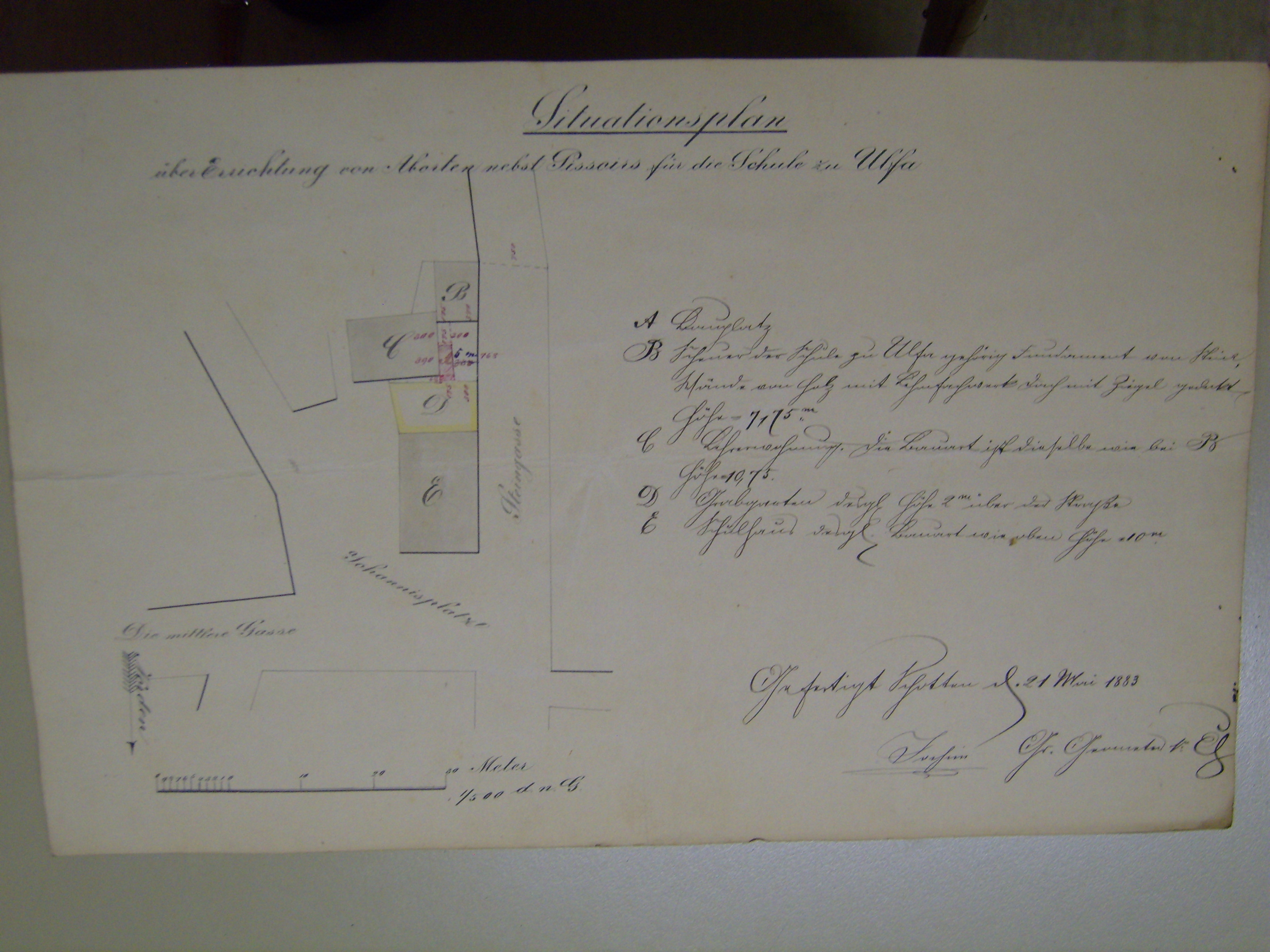 Im Mai 1883 wurde ein Plan zur Erbauung eines Abortgebäudes erstellt. Daraus ist ersichtlich, dass sich zwischen Schule und Lehrerhaus ein ca. 1,5 bis 2 Meter hoher Grabgarten befand, welcher auch noch um 1940 vorhanden war.