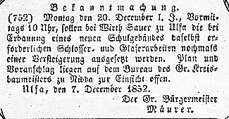 Am 7. Dezember 1852 finden wir eine Bekanntmachung der Gemeinde: