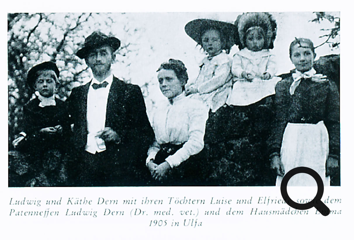 Am 30. September 1897 stand im Großherzoglich Hessischen Regierungsblatt, dass durch Erlaß vom 15. jenes Monats „dem Schulaspiranten Ludwig Dern, aus Rockenberg im Kreise Friedberg, eine Lehrerstelle an der Gemeindeschule zu Ulfa, im Kreise Schotten, übertragen worden sei“. Fünf Tage darauf, am 5. Oktober 1897, heiratete der frischgebackene Lehrer seine Käthe. Das junge Paar erhielt zunächst im Schulhaus eine Dienstwohnung. Mit einem Jahresgehalt von 900 Mark konnte man aber keine großen Sprünge machen. Ludwig Dern übernahm –inzwischen in das schöne Haus neben der Schule am Kircheingang übergesiedelt- im Jahre 1900 mit Freuden die Agentur der Kaiserlichen Post. Seine junge Frau, sie war bei der Heirat gerade 19 Jahre gewesen, hielt für die schulentlassenen Mädchen die so genannte „Industriestunde“ (eine frühe Form der Berufsschule) ab, in der sie ihnen Stricken und Nähen beibrachte. So verdienten beide ein paar Mark für ihre knappe Haushaltskasse dazu.